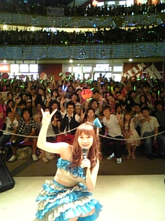 マネーヂャの市川さんとソニィの柳さんのMCののち、いよいよイヴェントの開始だ! そうして今日のこのシステムの最大の欠点が露呈する。座席を、徹夜してでも仲間の分も確保するほどの思い入れのある連中ばかりでは埋めなかった、せーで、しょこたんが歌っている最中のノリが、はっきりと悪い。うわ。僕の視界より後ろでせーぜー盛りわがっていてくざさいと祈るしかない。ちなみに僕はしょこたん♡ぶろぐの「ドリルブレイク」とゆうエントリィの写メ