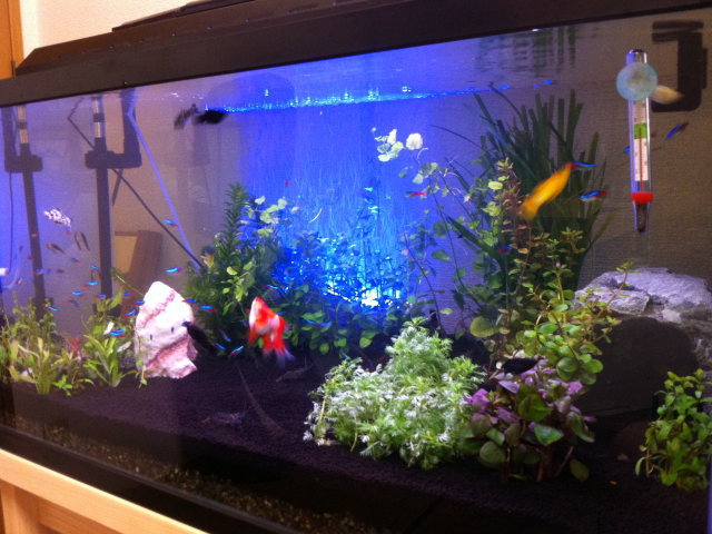 テトラ30匹、モーリー8匹、オトシンクルス8匹、ヌマエビ7匹、金魚1匹