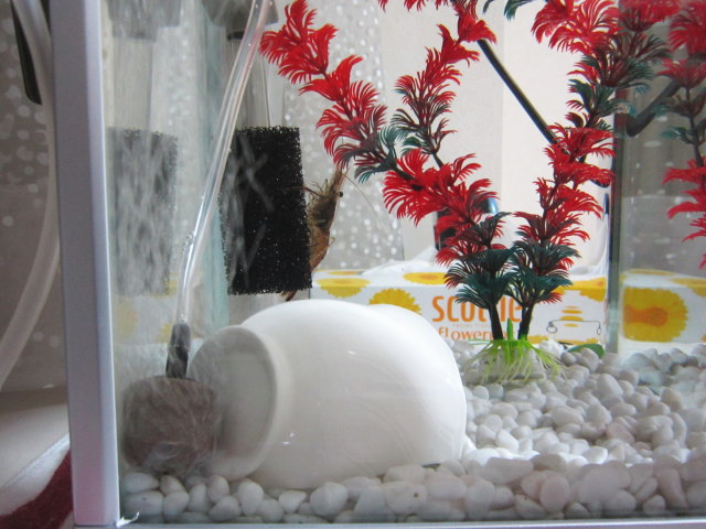弟が、川(河口近く)で釣ってきたテナガエビを、「1〜2匹くらい飼う♪」と言い出し、なぜか私が、エビ係隊長として飼育しています(笑)。