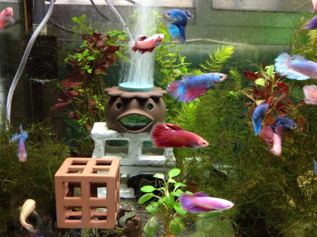 稚魚を孵化から一箇所で育てると、こんな風に一つの水槽でベタが複数飼えるので興味がある方やってみてね!