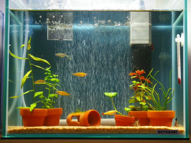 コリドラスとアカヒレは泡を気に入ったようで、突入→上昇を繰り返して遊んでいます(ダニオとエビはあまり興味なさそうです・・・)。