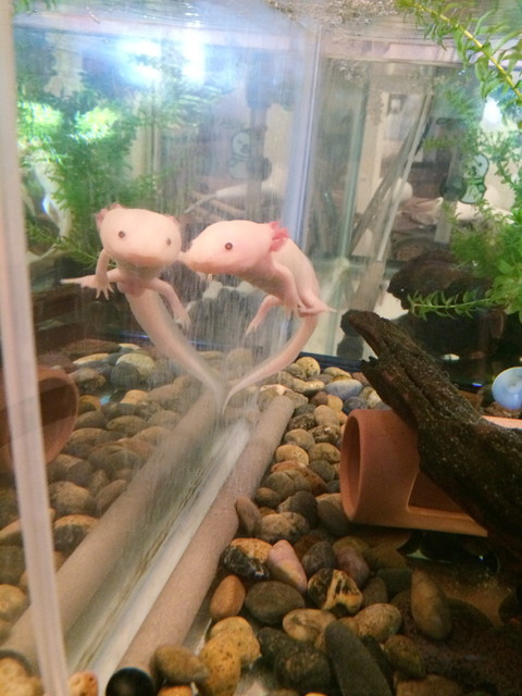 のりたまこさんの水槽 3歳のウーパールーパー(カバ吉)に18φ×300を、1歳のウーパールーパー(こつぶ)に23φ×350のエアストーンを使用しています。