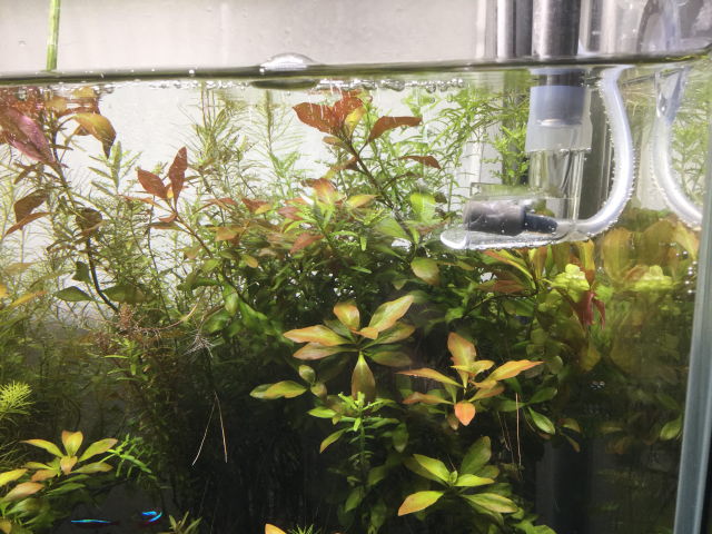 画像は、水草水槽の夜間エアレーション用(撮影のため照明点灯)に、10φ丸♯180を外部フィルター排水口に取り付けたものです。