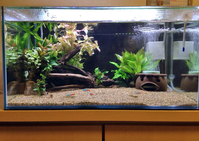 エアなしでも大丈夫かと思っていましたが、つけてみると魚たちの様子が随分と違うものですね。
