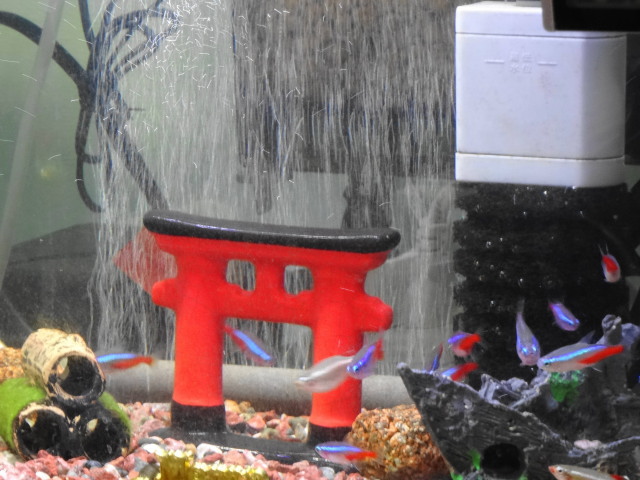 細やかな水泡と魚が戯れていて、見ていてとてもさわやかな感じがして、時の立つのを忘れ見とれてしまいます。