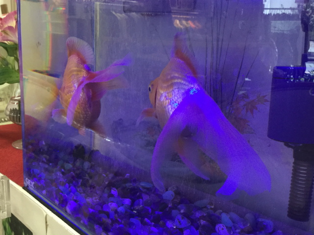 購入して2年目の土佐金です 水槽の後側には生け花のお写真 バブルで楽しそうに遊びます