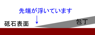 この場合は、包丁の先端部分に砥石があたらずに浮いてしまうため、刃先が研がれない状態になってしまいます。包丁を向こうに持っていったときには包丁を寝かせすぎないように注意しましょう!